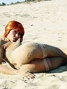 Nude sexy MILF in nylon stockings on the beach